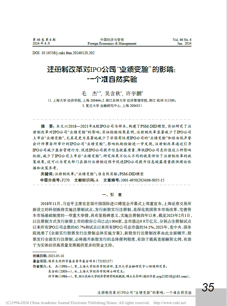 由伟德官网许宇鹏副教授作为通讯作者合作撰写的论文《注册制改革对IPO公司“业绩变脸”的影响:一个准自然实验》在《外国经济与管理》(学校A类期刊、CSSCI、FMS管理科学高质量期刊)2024年第6期上发表。该论文是许宇鹏副教授主持承担的国家自然科学青年基金项目的阶段性研究成果。